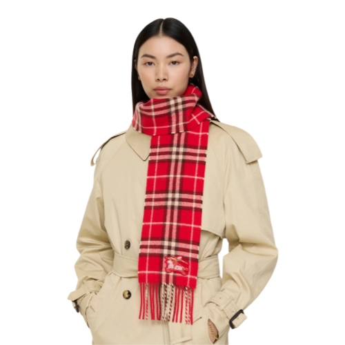 A cashmere scarf in crayon red Burberry Check, woven with metallic fibres for a subtle shimmer. Made in Scotland at a mill founded in 1797, the fabric is washed in local spring water and brushed with teasels for an ultra-soft finish. The style is finished with an appliquéd Equestrian Knight Design in textural threads – created as part of our Year of the Horse capsule.
