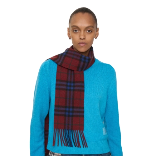 The iconic Burberry Check cashmere scarf, made in Scotland at a mill founded in 1797. Woven on traditional looms, the scarf takes more than 30 steps to complete. The fabric is washed in local spring water and brushed with teasels – dried flowers that are drawn along the surface of the cashmere to 'raise' the cloth, creating a natural lustre and ultra-soft finish.