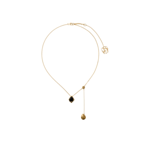 An adjustable chain-link necklace made in Italy from sterling silver with gold plating. The onyx-inlaid shield features a detachable cover that can be unclipped to hang as a drop pendant.
