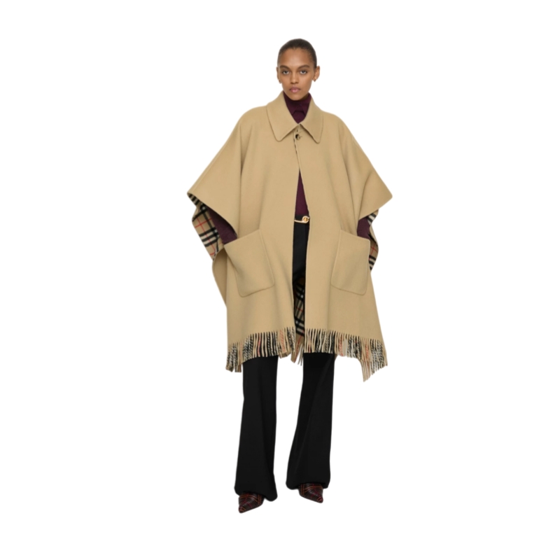 A cape woven in Italy from double-faced wool, reversing from a solid colour to the Burberry Check in signature sand beige. Drawing on our outerwear heritage, the style is tailored with a neat point collar and button closure.