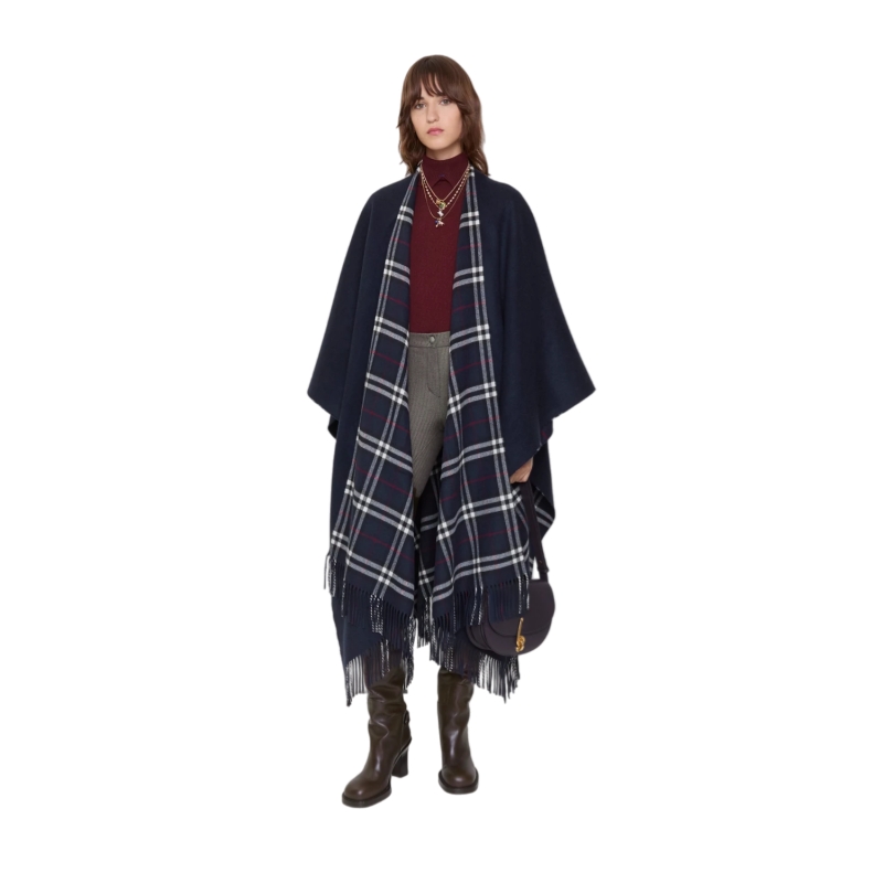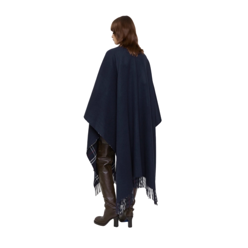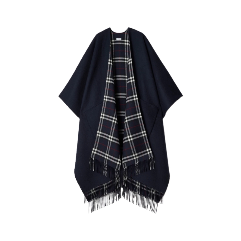 A cape made from double-faced wool cashmere at a Scottish mill founded in 1797, washed in local spring water and brushed for a soft finish. The style reverses from a solid colour to the Burberry Check and is embroidered with a tonal Equestrian Knight Design.