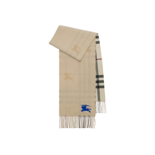 A scarf in double-faced cashmere, made at a Scottish mill founded in 1797. The reversible style switches from the Burberry Check to a solid colour woven and embroidered with our Equestrian Knight Design. The fabric is washed in local spring water and brushed with teasels – dried flowers that are drawn along the surface of the cashmere to ‘raise’ the cloth, creating a natural lustre and ultra-soft finish.