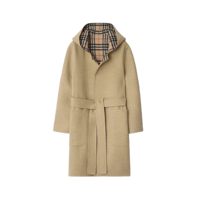 A wrap coat made in Italy from double-faced wool, reversing from a solid colour to the Burberry Check. The hooded style is cut to a relaxed fit and has a detachable belt to adjust the shape.