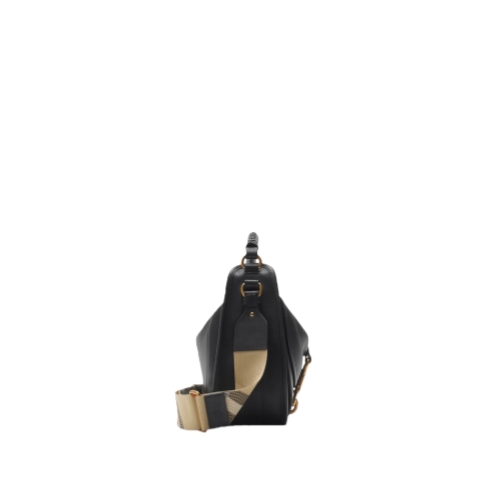 Debuted on the Burberry Summer 2025 runway, a softly structured messenger bag made in Italy from calf suede. The curved style is unlined and takes its name from the logo-engraved ‘b’ dog clip at the front pocket, with brushed metal hardware and a hand-stitched top handle inspired by equestrian saddles. The adjustable webbing strap is woven with the Burberry Check and the back panel is subtly embossed with our Equestrian Knight Design.