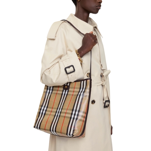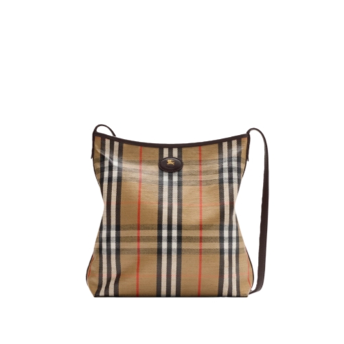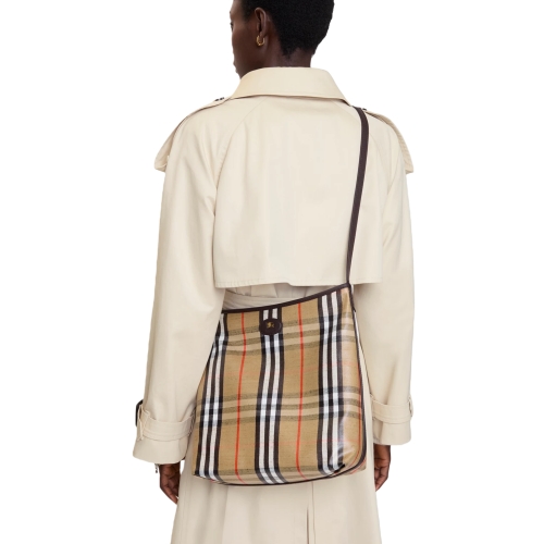 Rooted in the outdoors, the Highlands shoulder bag is made in Italy from a cotton linen blend trimmed with smooth calf leather. The fabric is jacquard-woven with the Burberry Check and has a coated finish inspired by rainwear. The unlined design is detailed with a slim shoulder strap and our Knight stamp, an archival motif first seen on Burberry bags in the 1980s.