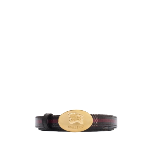 A belt made in Italy from a coated cotton linen blend, jacquard-woven with the Burberry Check in a seasonal mahogany red. The design reverses to smooth calf leather and features a metal buckle detailed with our logo and Knight stamp, an archival motif from the 1980s.