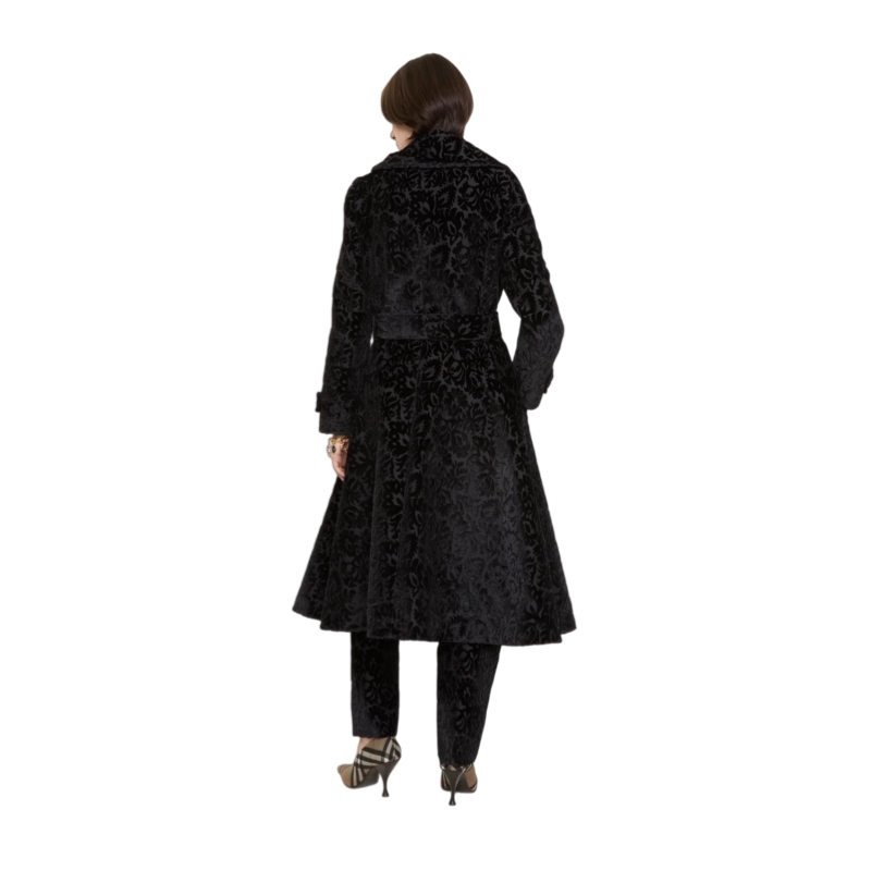 A coat made in Italy from silk blend velvet, jacquard-woven with intertwining flora and fauna. The textural fabric is inspired by the richly furnished interiors of great country houses. Debuted on the Burberry Winter 2025 runway, the style is tailored to an A-line silhouette with a slim, belted waist and fuller skirt.