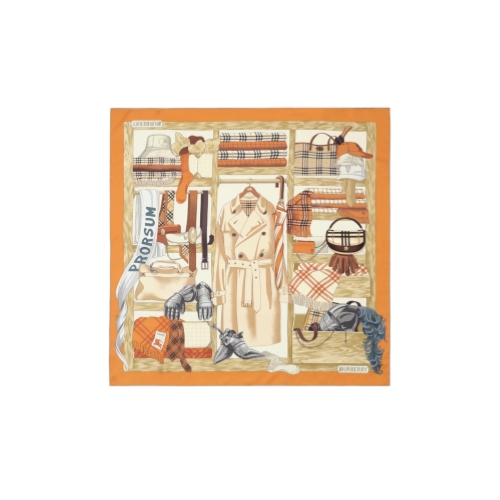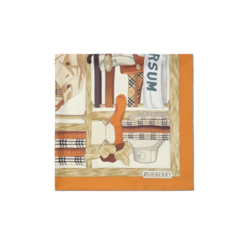 A square scarf in silk twill, inspired by an archival design from 1995. The hand-drawn artwork features all the elements of a classic Burberry wardrobe, from check bags and scarves to our iconic trench and Equestrian Knight’s armour.