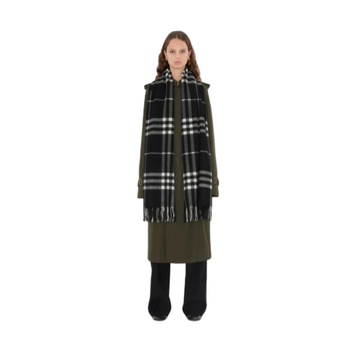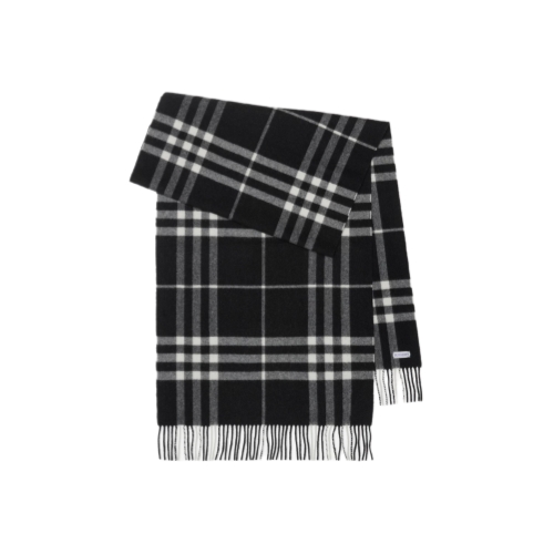 A Burberry Check cashmere scarf, made in Scotland at a mill founded in 1797. Woven on traditional looms, the fabric is washed in local spring water and brushed with teasels – dried flowers that are drawn along the surface of the cashmere to 'raise' the cloth, creating a natural lustre and ultra-soft finish. Two further washes are given for a fuller texture.