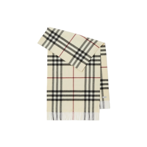 A Burberry Check cashmere scarf, made in Scotland at a mill founded in 1797. Woven on traditional looms, the fabric is washed in local spring water and brushed with teasels – dried flowers that are drawn along the surface of the cashmere to 'raise' the cloth, creating a natural lustre and ultra-soft finish. Two further washes are given for a fuller texture.