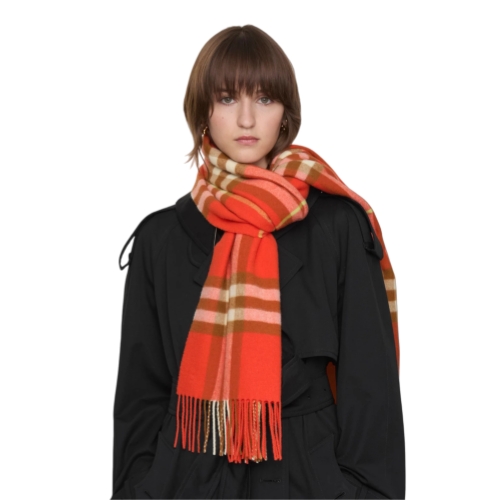 A Burberry Check cashmere scarf, made in Scotland at a mill founded in 1797. Woven on traditional looms, the fabric is washed in local spring water and brushed with teasels – dried flowers that are drawn along the surface of the cashmere to 'raise' the cloth, creating a natural lustre and ultra-soft finish. Two further washes are given for a fuller texture.