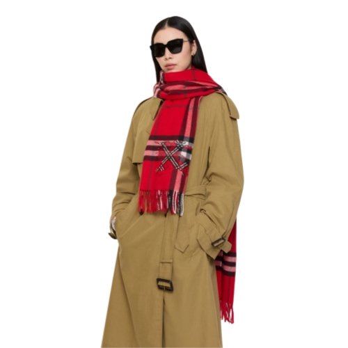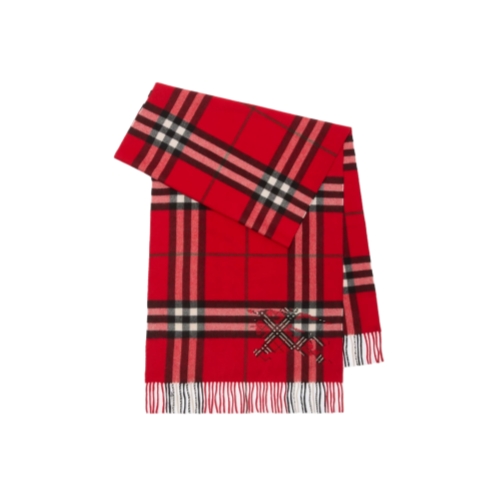A cashmere scarf made in Scotland at a mill founded in 1797. The style is patterned with the Burberry Check and cross-stitched with a tonal Equestrian Knight Design. Woven on traditional looms, the fabric is washed in local spring water and brushed with teasels – dried flowers that are drawn along the surface of the cashmere to 'raise' the cloth, creating a natural lustre and ultra-soft finish. Two further washes are given for a fuller texture.