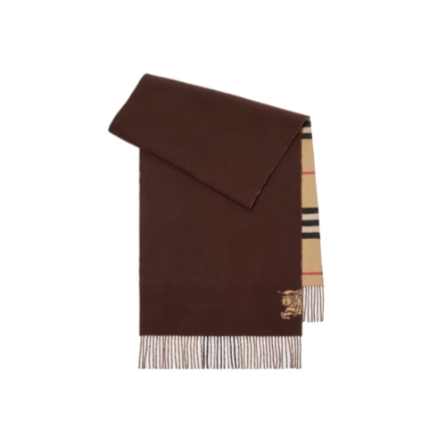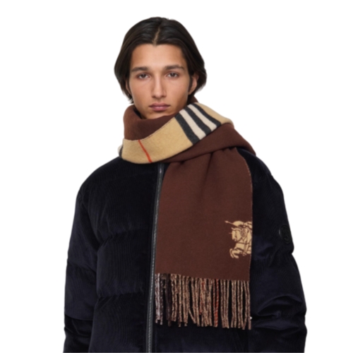 A cashmere scarf made at a Scottish mill founded in 1797. The reversible style switches from the Burberry Check to a solid colour and is jacquard-woven with our Equestrian Knight Design. The fabric is washed in local spring water and brushed with teasels – dried flowers that are drawn along the surface of the cashmere to ‘raise’ the cloth, creating a natural lustre and ultra-soft finish.