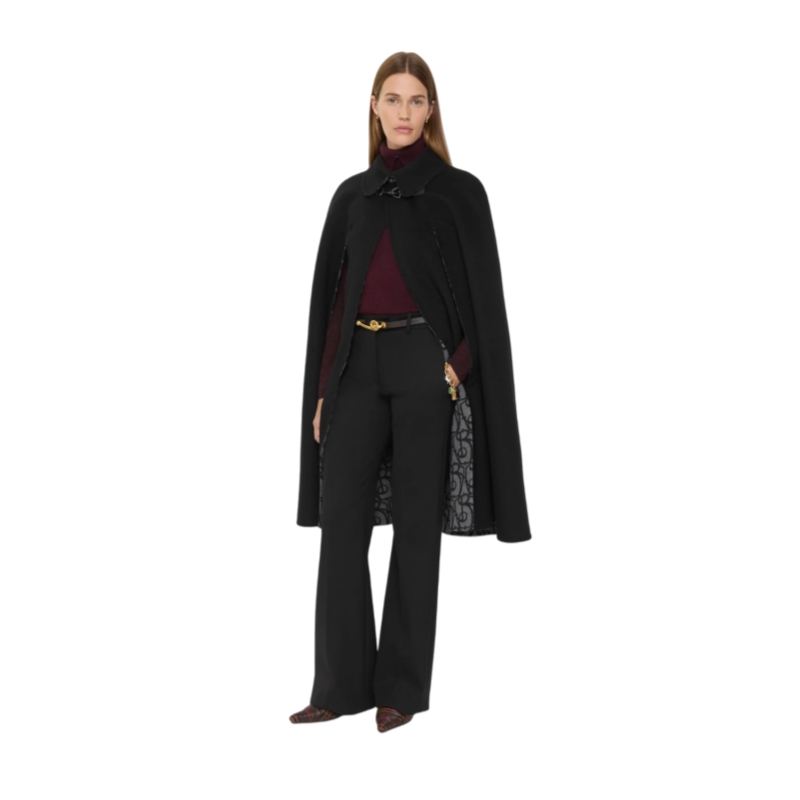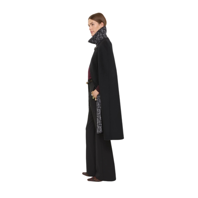 A cape made in Italy from a double-faced blend of wool, cashmere and silk with a jacquard-woven B charm pattern at the inner. The tailored style features exaggerated front slits and is secured with a horse-shaped clip inspired by our Equestrian Knight Design.