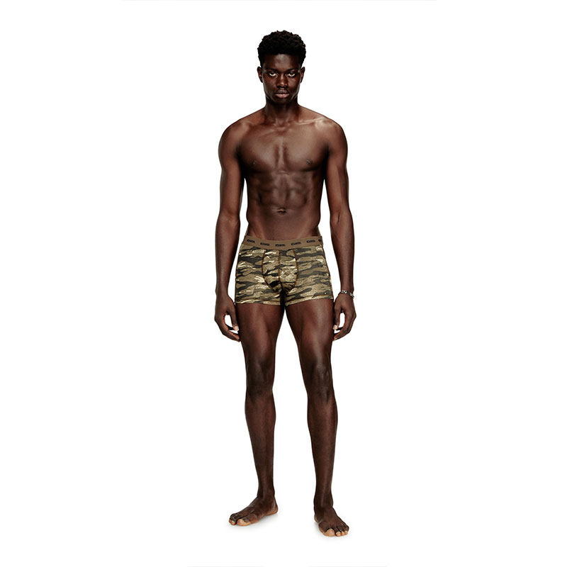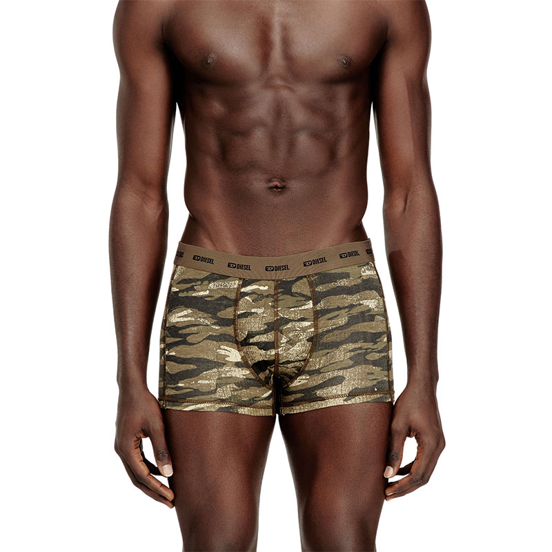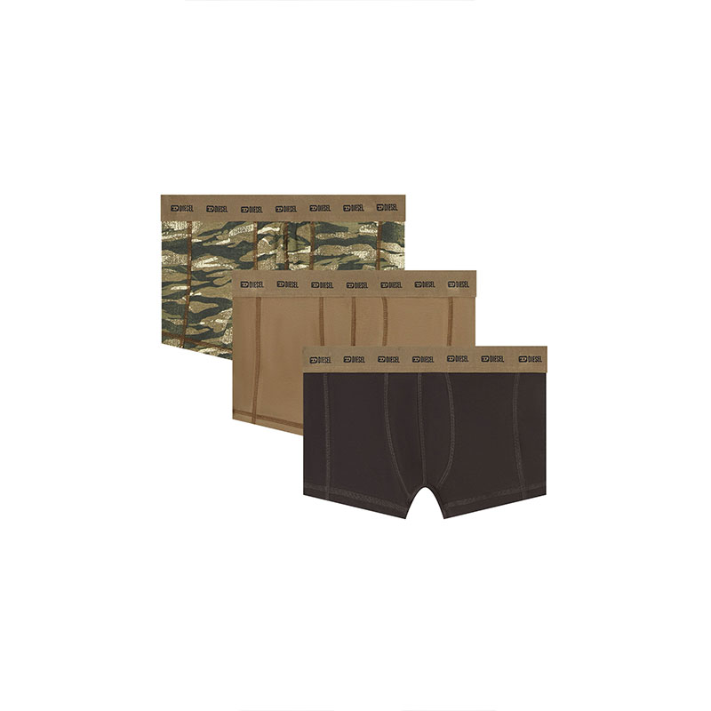 Three-pack of men's boxer briefs cut from soft stretch cotton. This set features two plain pairs and one camouflage design, each finished with a jacquard Diesel logo waistband.