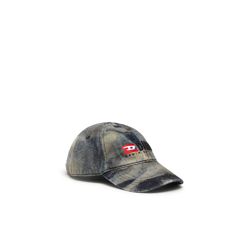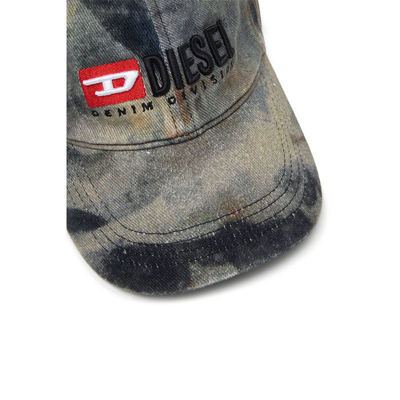 This baseball hat is crafted from cotton gabardine with an all-over camouflage-inspired print, featuring a structured visor and tonal stitching. Embroidered Diesel Denim Division logo and contrast red D patch at the front, while the back showcases an adjustable strap for a customizable fit.