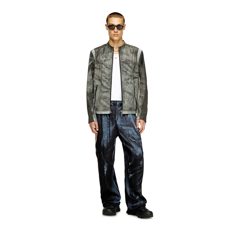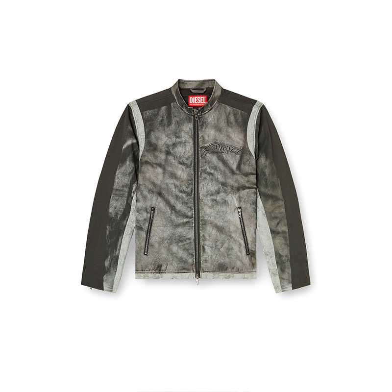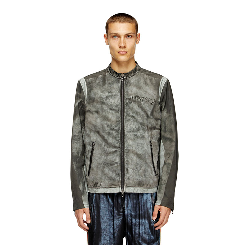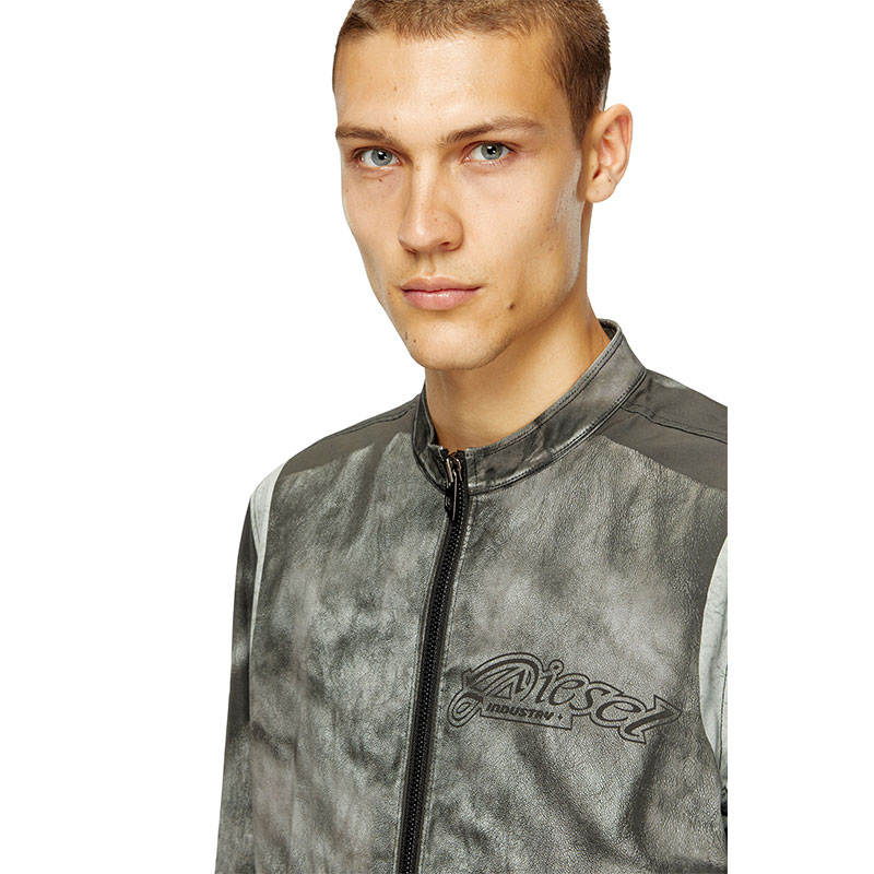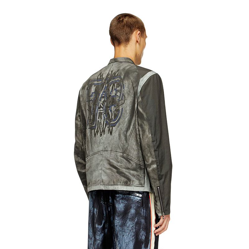 Looks like faded black leather, but made from printed cotton-nylon canvas. This men's regular-fit jacket is a trompe l'oeil creation, cementing its biker influences with zip cuffs and a snap button racer collar. Branded with an edgy 78 print on the back.