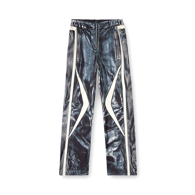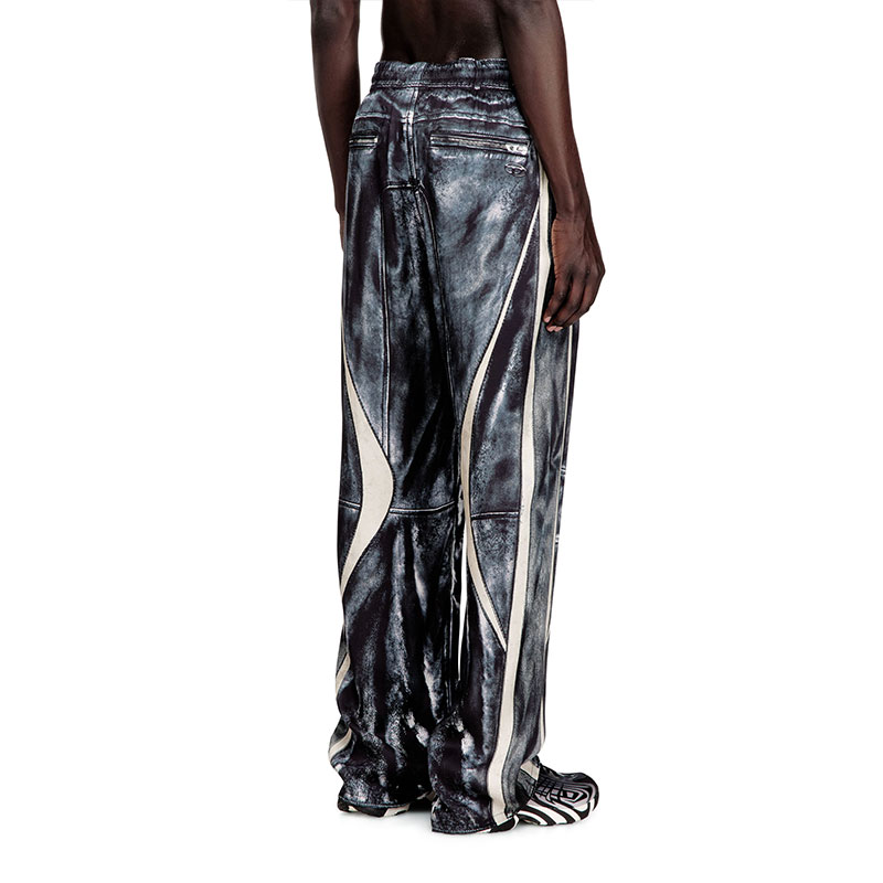A moto pant illusion, these men’s satin trousers feature a hyper-realistic trompe l'oeil print that mimics the look of colour-block biker leathers, right down to the zips. The fabric is woven from lower-impact cellulosic viscose fibres and moves with fluid ease. A hidden drawstring secures the elasticated waist.