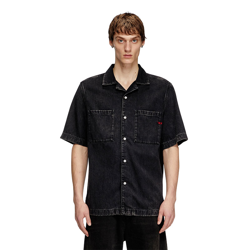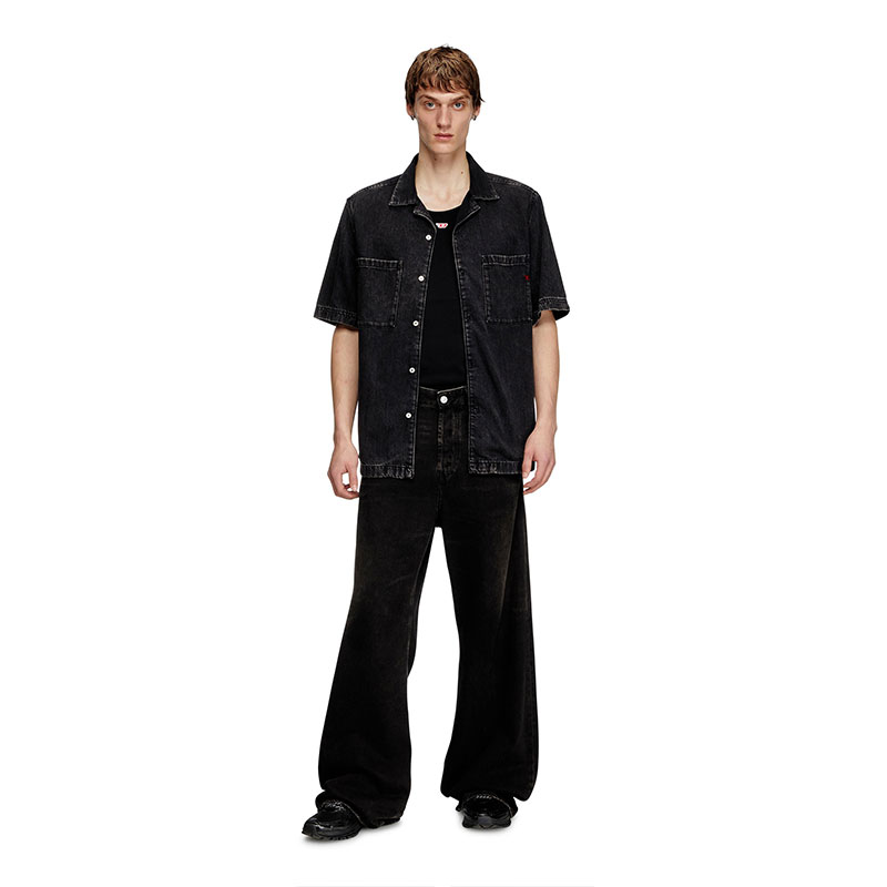 Men's bowling shirt in black TENCEL Lyocell denim with subtle treatments, featuring a camp collar and short sleeves. Detailed with a red D logo embroidery on the left chest pocket.