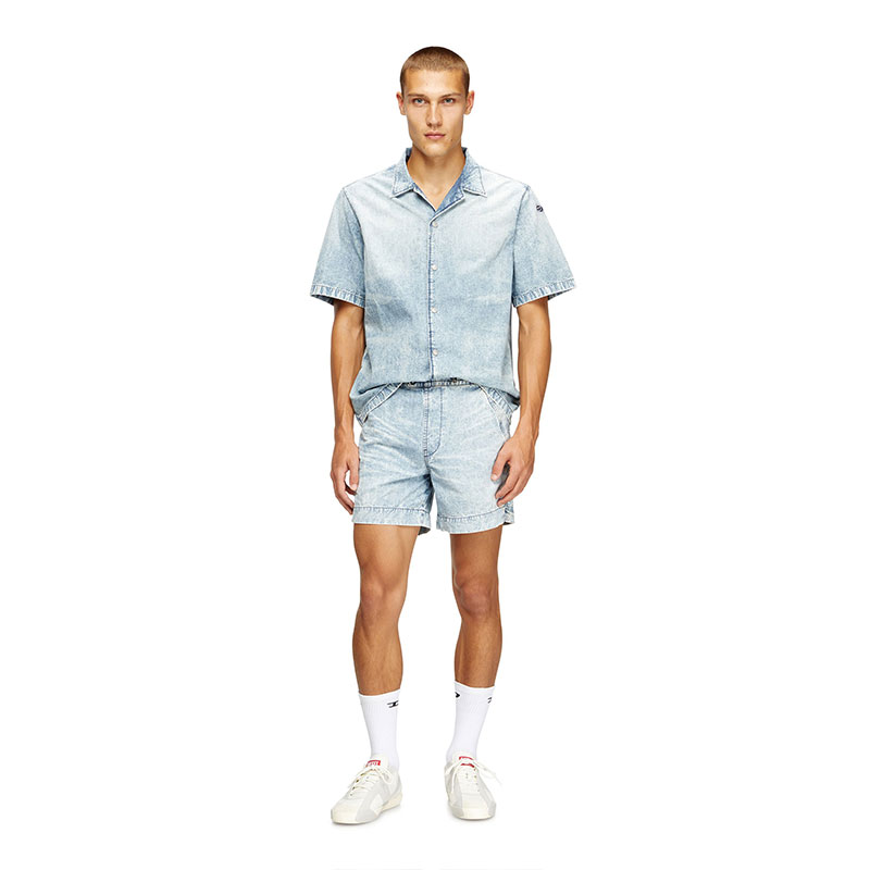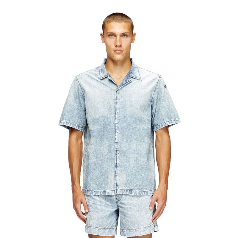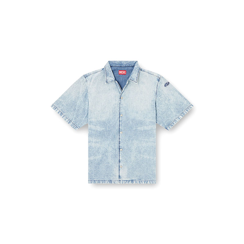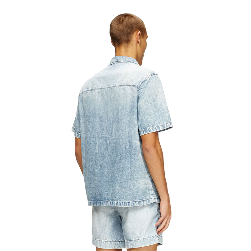 Men's short-sleeve bowling shirt cut to a regular, boxy fit. Branded metal snap buttons and a cut-out Oval D on the sleeve complete the style. Made using a percentage of organic cotton, this light blue wash is cut from cross-weave fix denim – the lightweight fabric is detailed with special laser technology to create the intricate artwork of whiskers and worn areas. A final stonewash treatment lends a unique, '80s-inspired marbled finish.