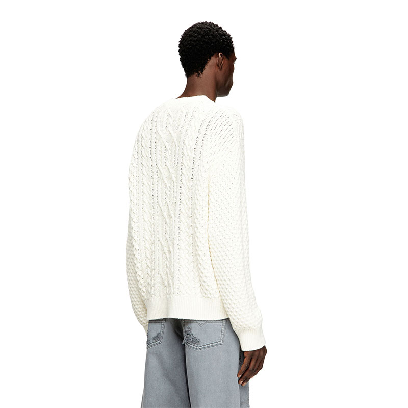 This men's sweater is knitted using a variety of stitches to create its multi-textural finish, with plenty of cables and Diesel lettering – the logo design is equal parts statement and stealth. Spun from wool and cotton, it has a classic crewneck profile and ribbed trims.