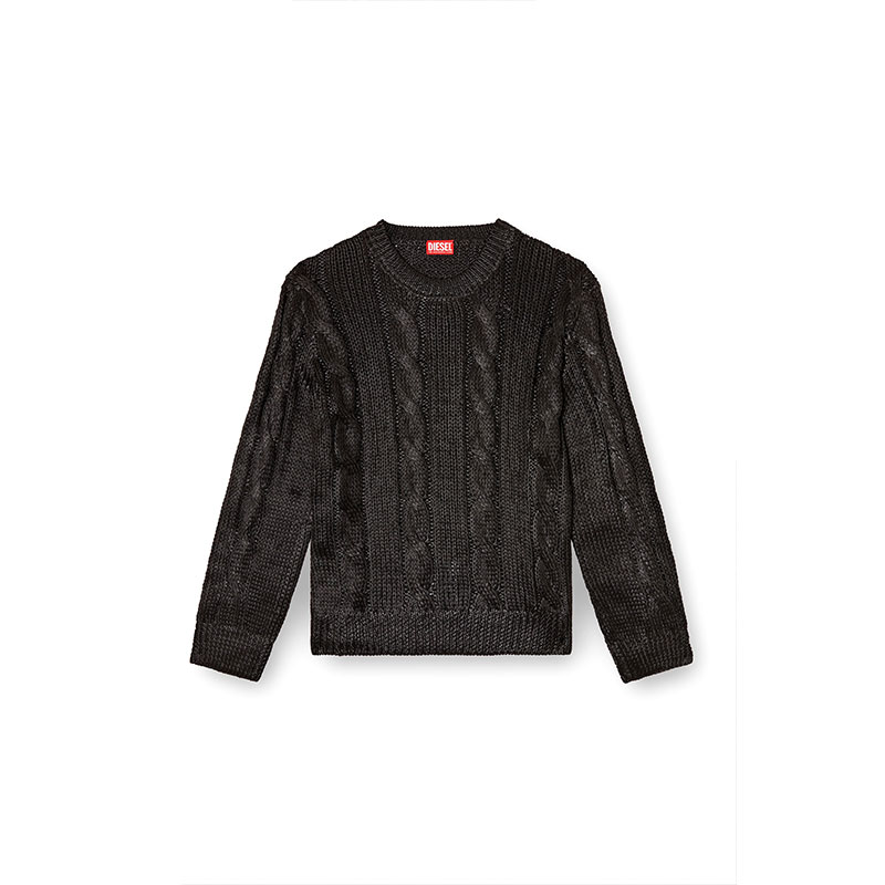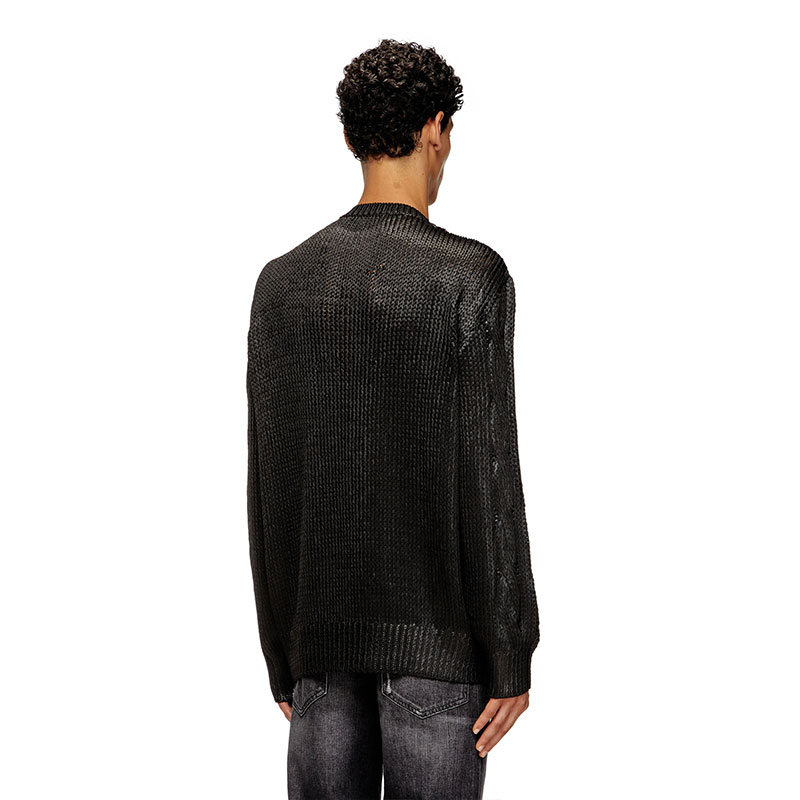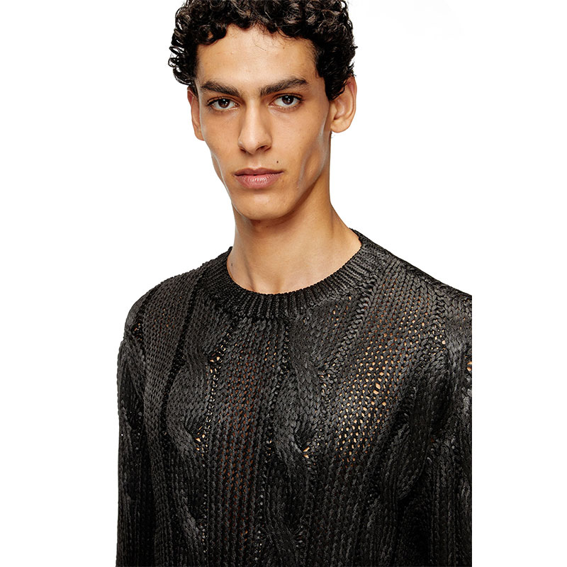 A subversion of a classic knit, this men’s sweater feels celebratory in an understated way. It’s knitted with cables on the front and sleeves and heat-pressed to give it the sleek, shiny finish.