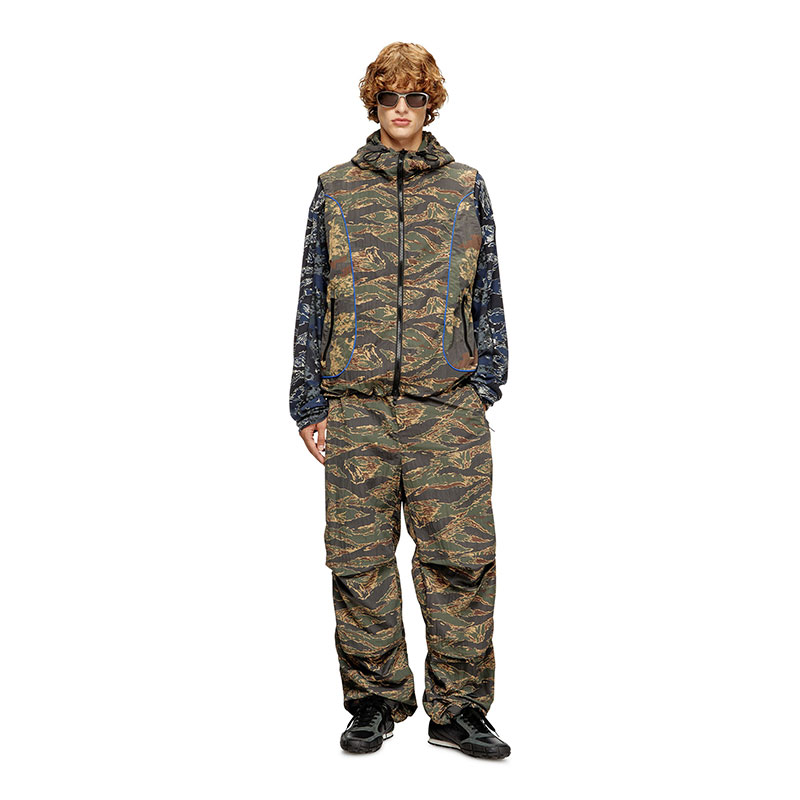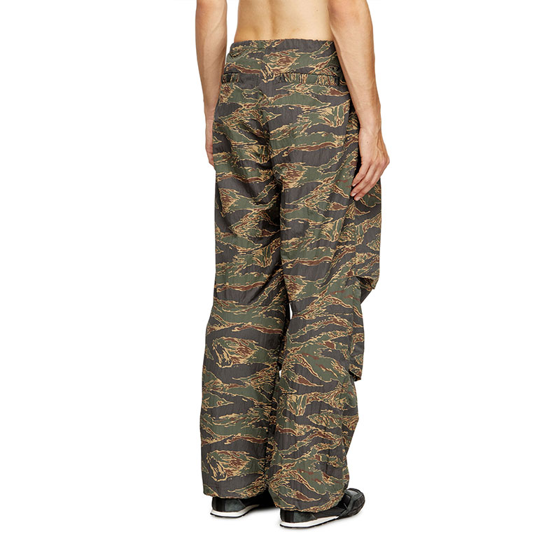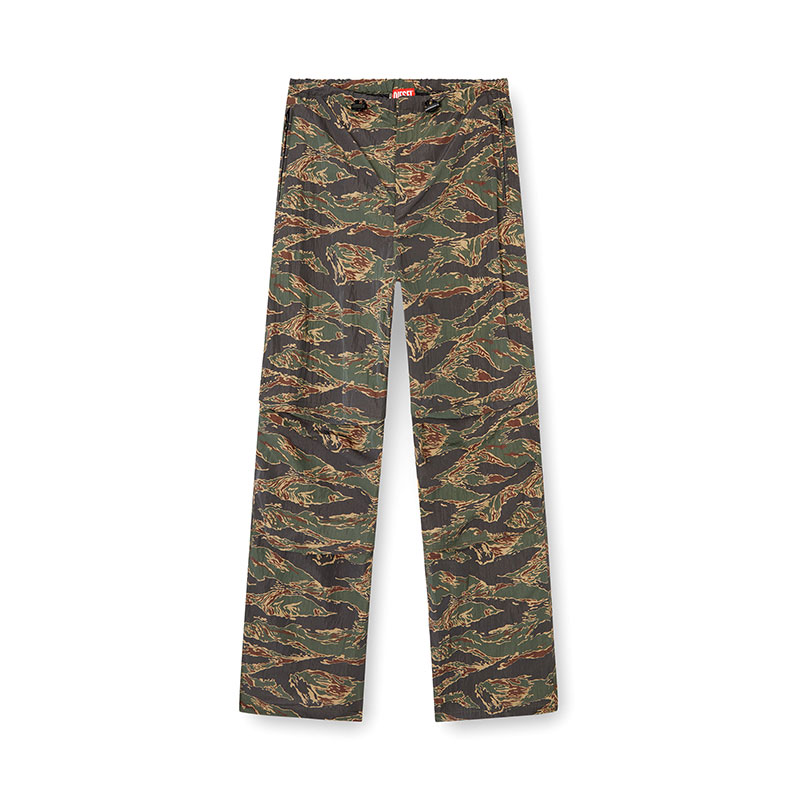 These men's trousers are built from recycled nylon with a wrinkled texture, printed with a stylised camouflage motif in a classic khaki colourway. Toggle drawstrings secure the waist and cuffs.