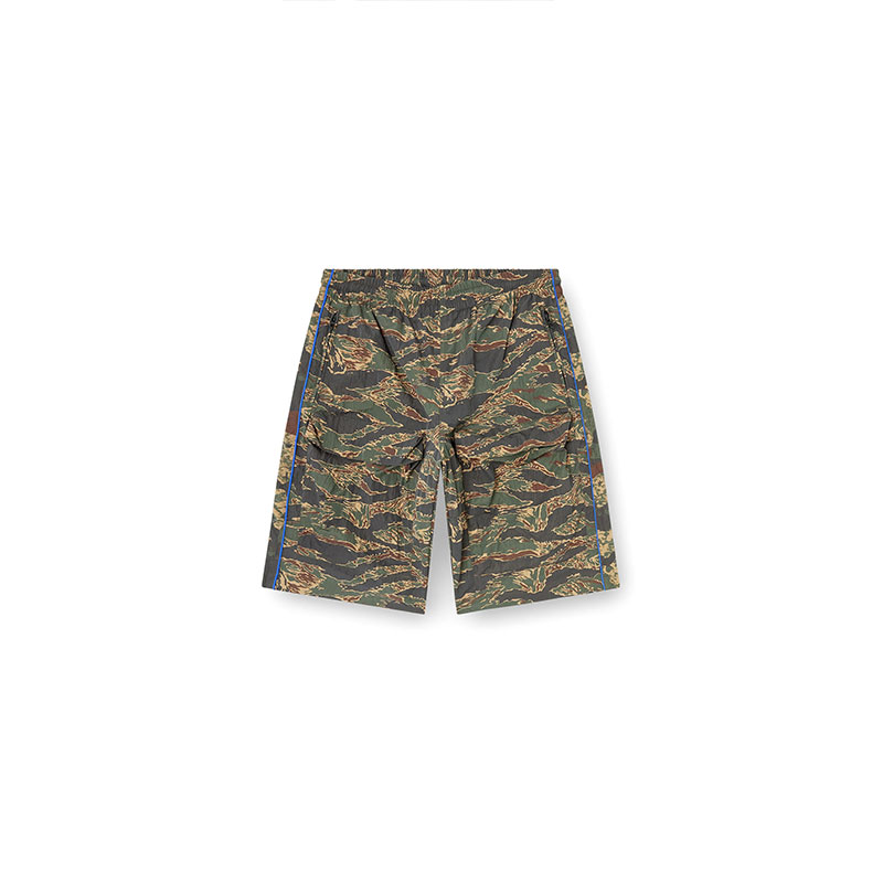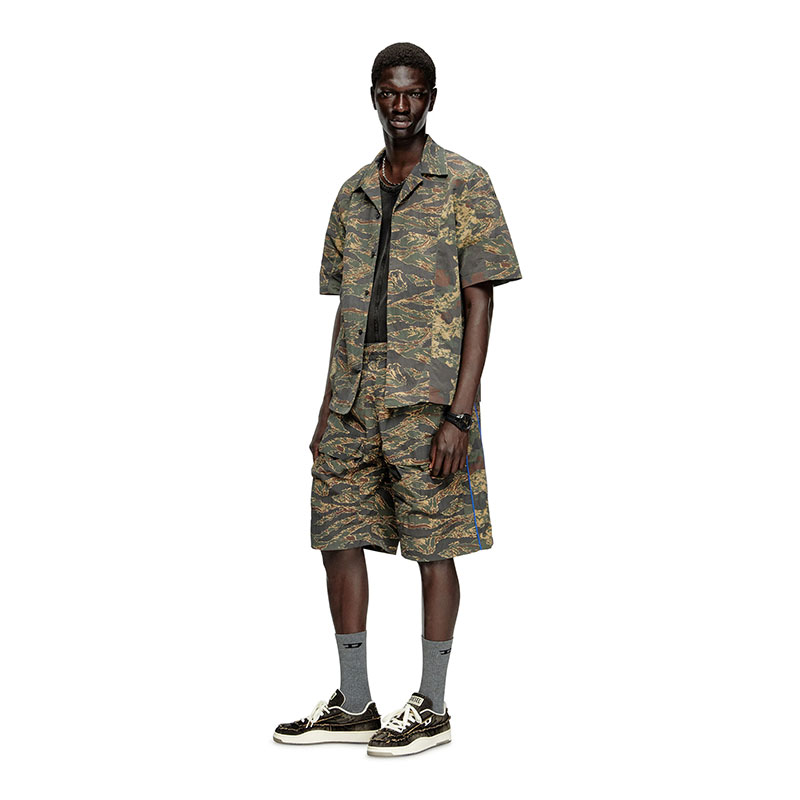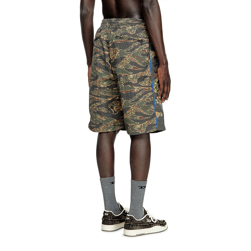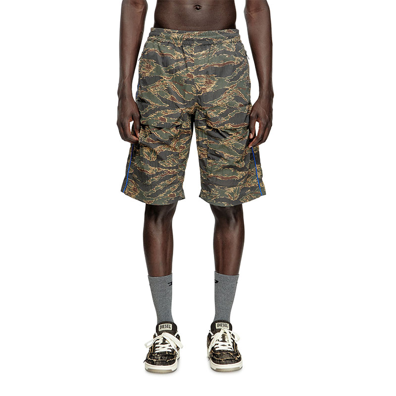 These men's shorts are built from recycled nylon with a wrinkled texture, featuring contrast-print side panels with piped edges for a fresh take on classic khaki camo. Their regular cut is topped with cargo pockets.