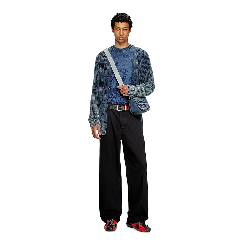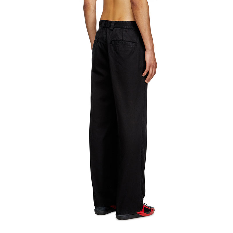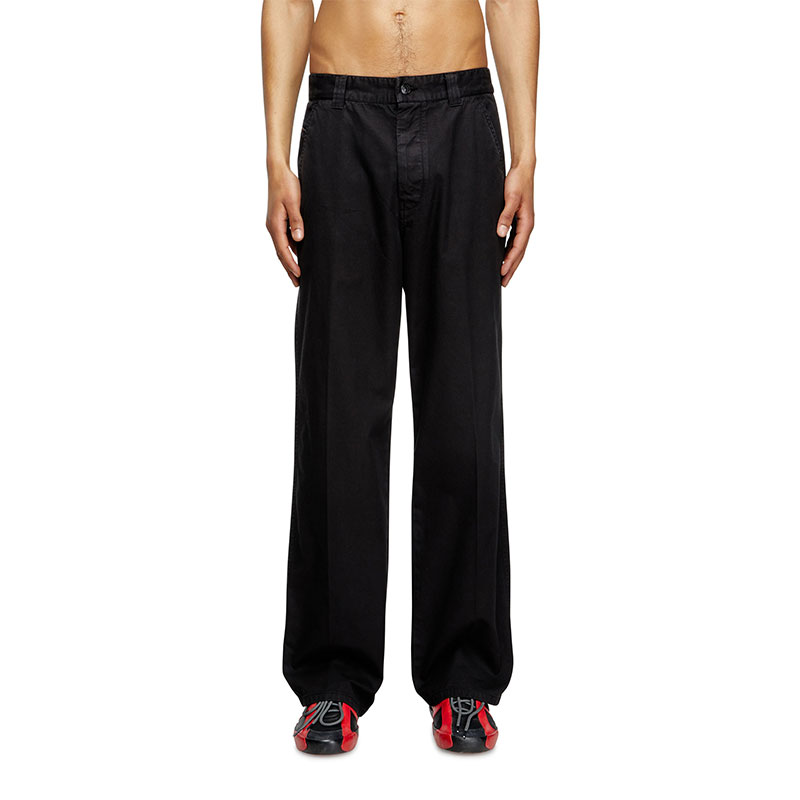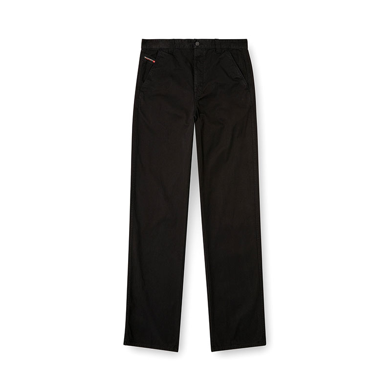 Men’s black chino trousers in organic cotton twill, featuring a regular fit and slightly treated finish. The small pocket with the iconic Diesel Industry flag and metal shank buttons at the waist and fly nod to the classic construction of jeans.