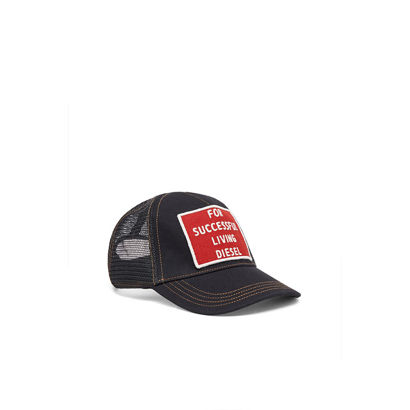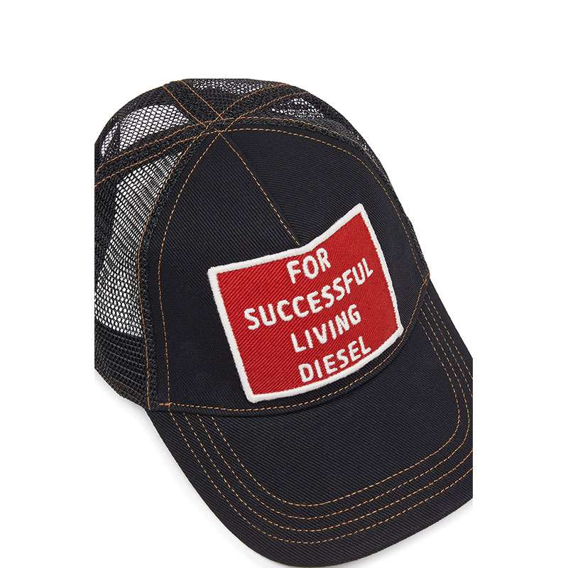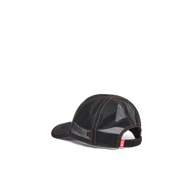 Cotton cap featuring structured front panels with visible contrasting stitching and mesh fabric on the sides and back for enhanced breathability. Detailed with a bold embroidered Diesel patch on the front, pre-curved visor with stitched accents and an adjustable back closure designed for a comfortable fit.