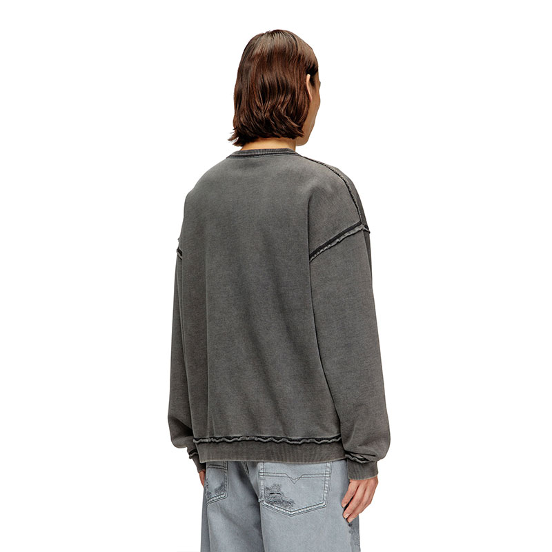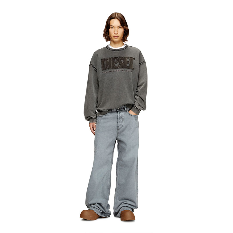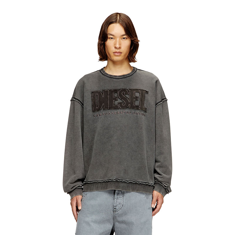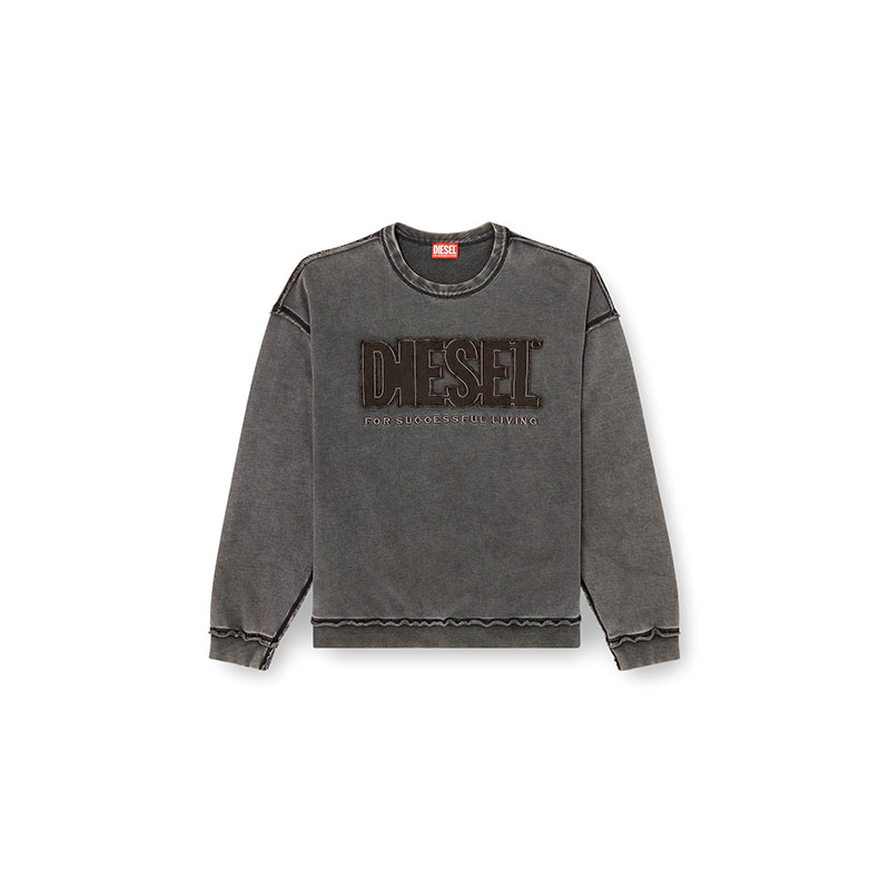 Crew neck sweatshirt with a relaxed fit, made of unbrushed fleece with a percentage of organic cotton. Featuring a ribbed collar, cuffs, and lower hem, it showcases a Diesel For Successful Living application and embroidery on the front, enriched with visible external seams and raw cut edges. The sweatshirt has undergone an acid washed treatment and garment dyeing, giving it a distinctive worn effect.