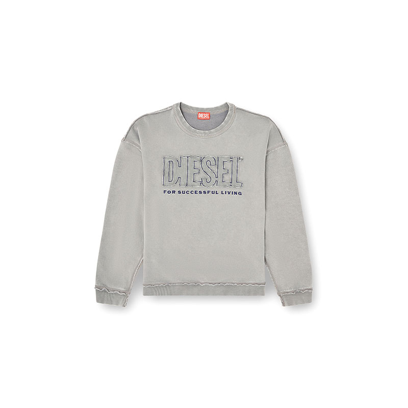 Crew neck sweatshirt with a relaxed fit, made of unbrushed fleece with a percentage of organic cotton. Featuring a ribbed collar, cuffs, and lower hem, it showcases a Diesel For Successful Living application and embroidery on the front, enriched with visible external seams and raw cut edges. The sweatshirt has undergone an acid washed treatment and garment dyeing, giving it a distinctive worn effect.