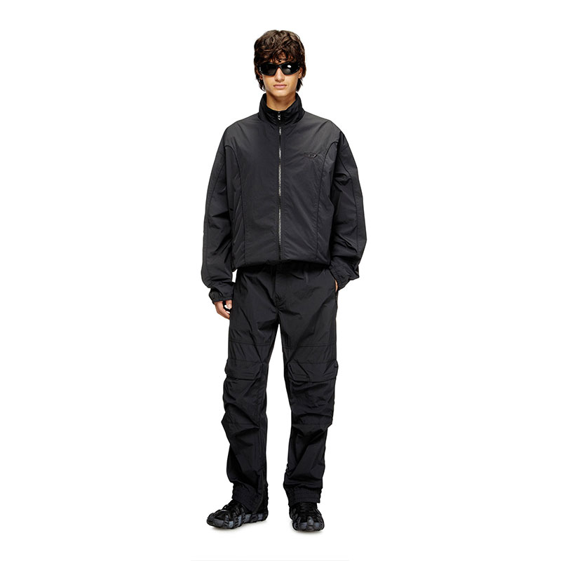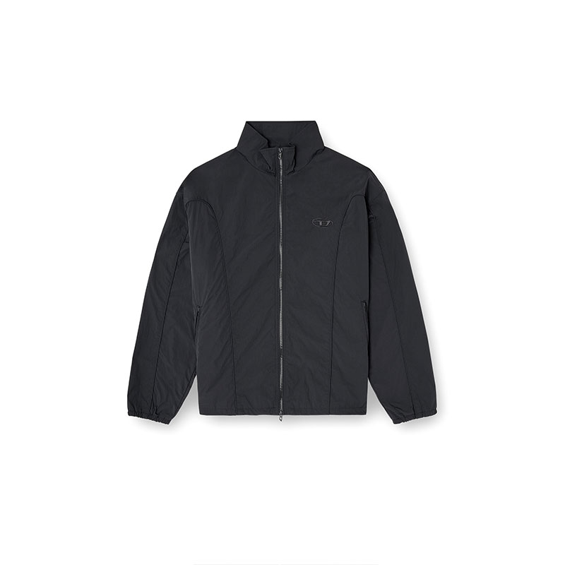 This men’s lightweight jacket is made from crinkled recycled nylon in a dense compact weave for added resilience. It has a high neckline, elasticated cuffs and bungee cords to adjust the hem. Piping details and an embroidered Oval D on the chest complete this all-black urban design.