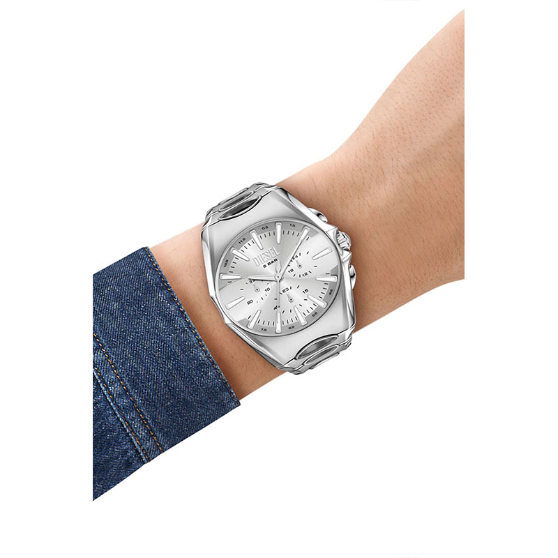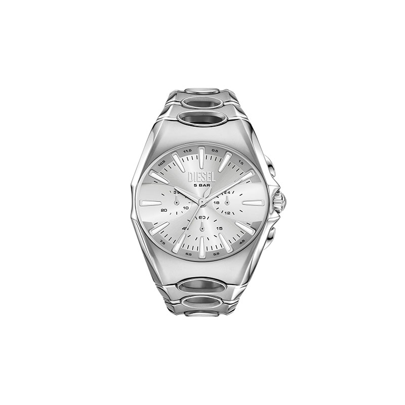 Diesel's 44mm D-Curve watch features a silver sunray dial, chronograph movement, and a stainless steel bracelet that is made more unique by circular cut-outs.