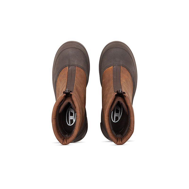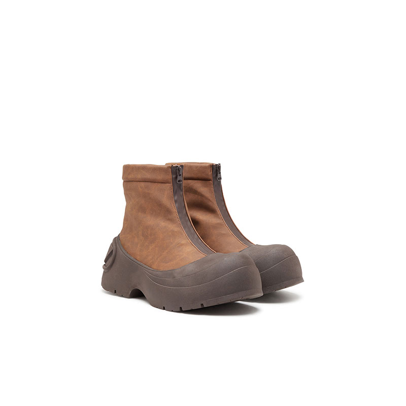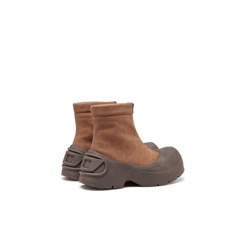 Ultra-chunky and functional, these men's brown ankle boots have a flexible upper fitted with a dual closure – undo the waterproof zip to access the laces. The exaggerated rubber sole climbs over the toes for added protection and features a large Oval D logo moulded into the heel.