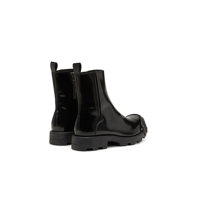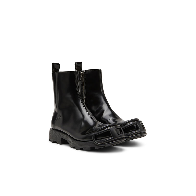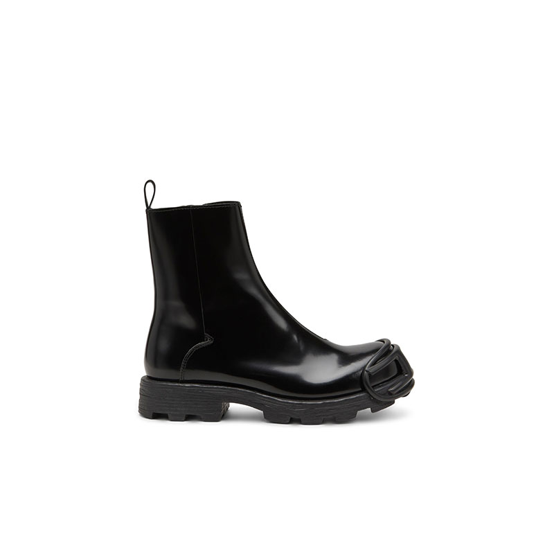 These men's ankle boots replace classic steel toe caps with rugged moulded Oval D plaques – the signature hardware is made from TPU and has a burnished metallic finish. Designed in a Chelsea silhouette, they're made from high-gloss black leather with extra-thick lug soles and zips on the side.