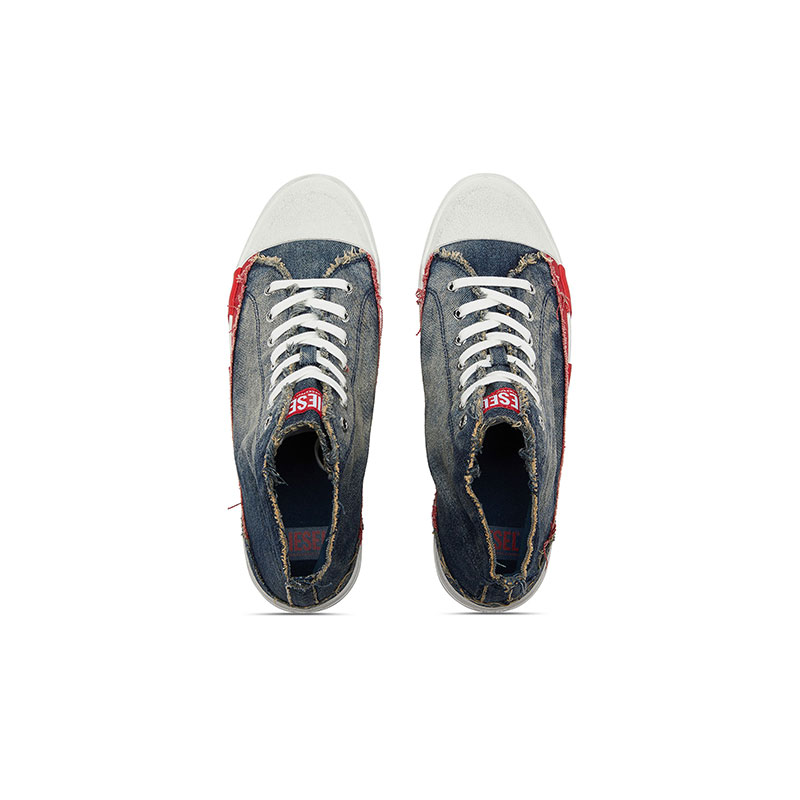 Diesel’s signature red D, blown up and doubled down. Flanking the sides of this men’s high-top sneaker, the emblem spans the upper and sole – half stitched in fabric, half cast in rubber for a cool dual identity. The faded denim construction and raw frays channel the brand's DNA. Set on a vulcanised rubber sole with a gripped red bottom.