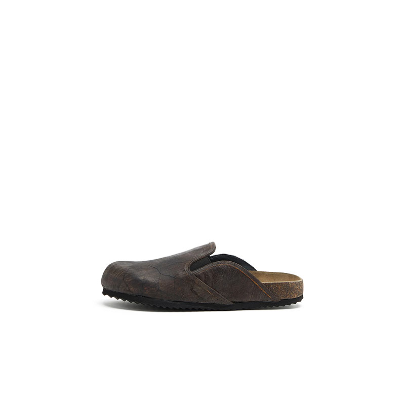 Men's mules with a classic clog silhouette. Updated in premium crackle-effect suede with a burnished brown hue, these shoes deliver a distressed, vintage look. The slip-on upper is detailed with elasticated inserts for a more flexible fit and set on a comfortable cork-mix footbed and grippy serrated sole. The logo flag is an iconic Diesel jean hallmark.
