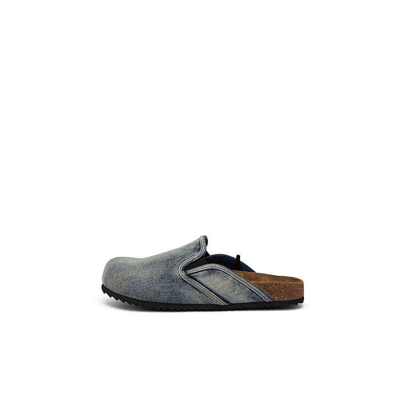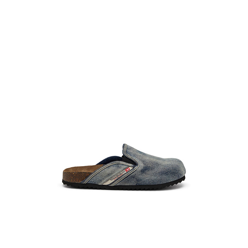 These men's mules rework the rustic, bohemian vibe of a clog in a contemporary way. Endlessly versatile, they're made from washed denim with elasticated inserts and the iconic fifth pocket logo traditionally seen on Diesel jeans. The suede-lined moulded cork-blend footbeds and rubber soles ensure comfort and grip.