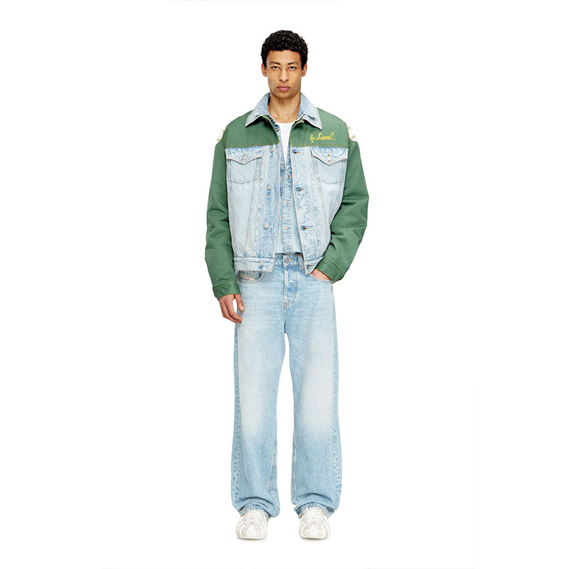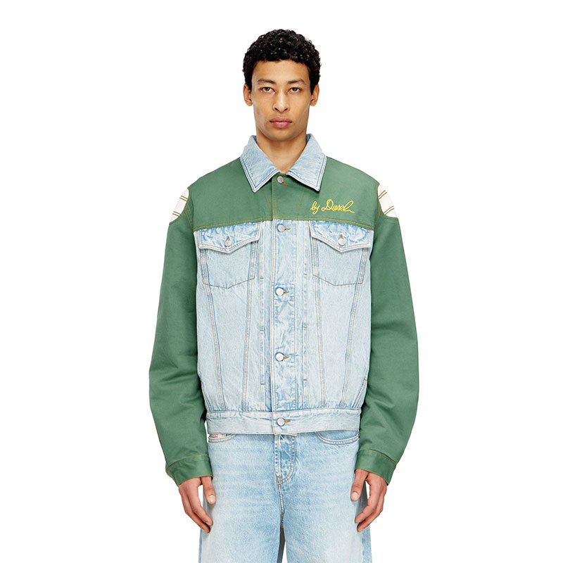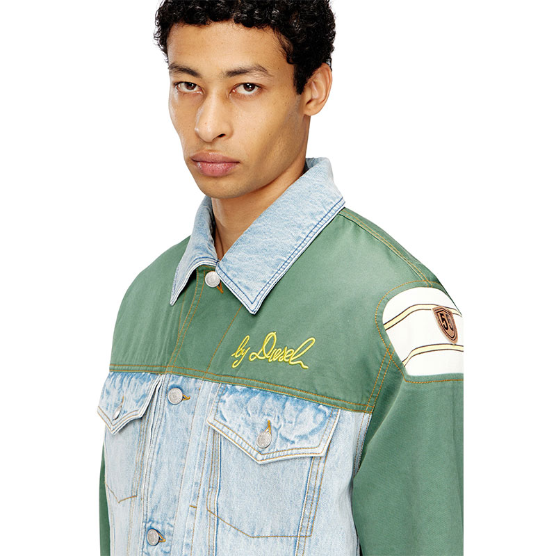 Jacket crafted from denim with a mixed-material design, featuring cotton gabardine sleeves. The piece includes a light padded lining for comfort without adding weight. Embroidered yellow “by Diesel” lettering on the chest, decorative shoulder patches, and metal buttons enhance its distinctive look. Finished with chest flap pockets and adjustable waistband tabs, this jacket embodies a contemporary, unisex attitude.