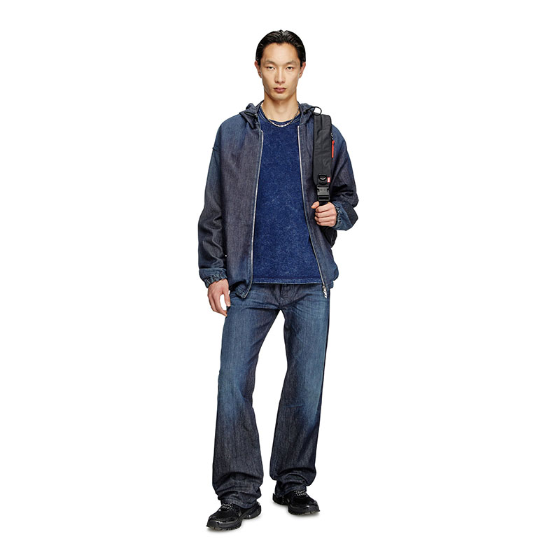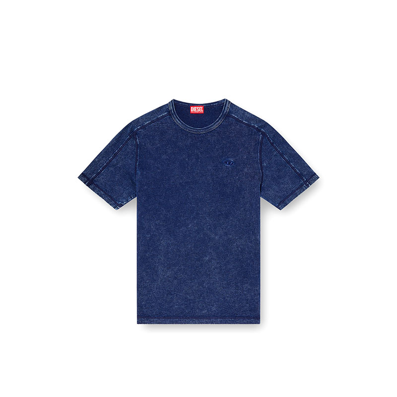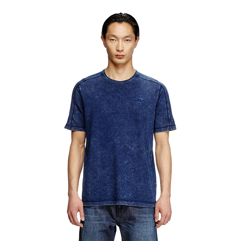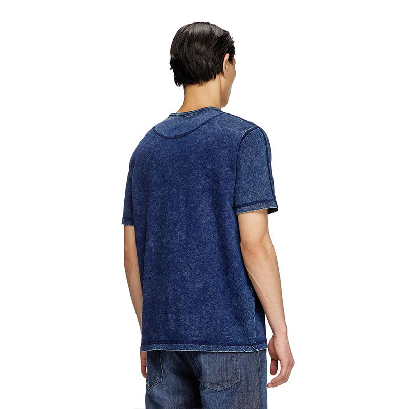 The fabric of this men's crew neck T-shirt looks like denim, yet feels like soft jersey. The cotton jersey is marble washed for a denim-style distressed finish, with tonal external cover stitching that highlights its construction. A tonal D is embroidered on the left chest.