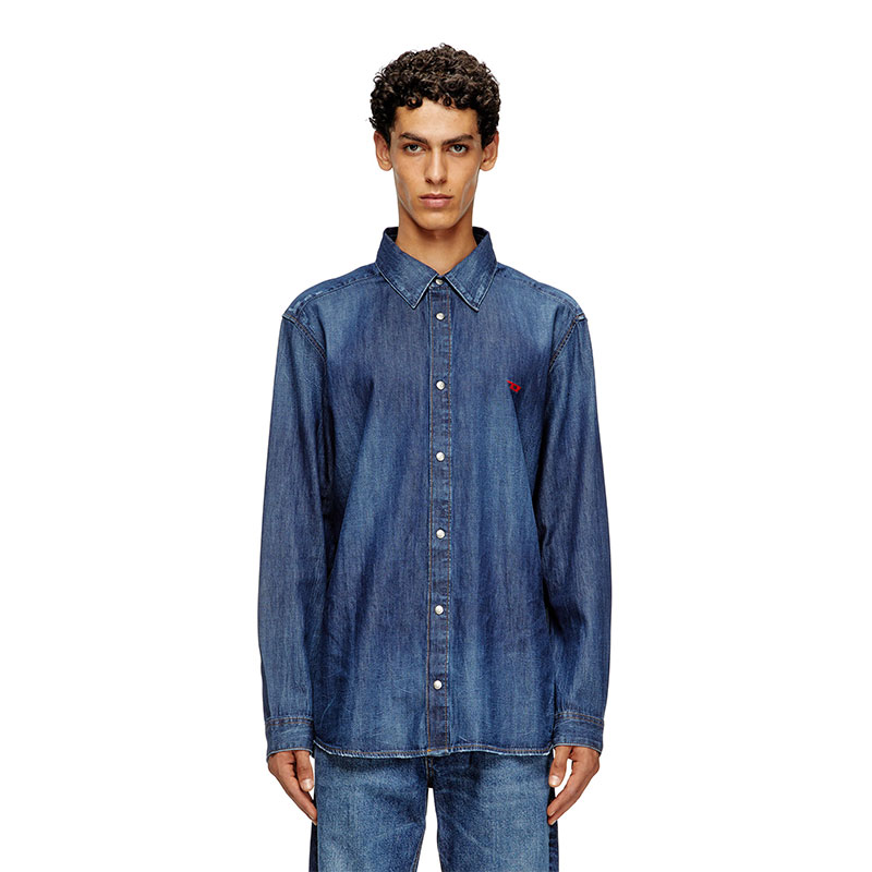 Denim shirt with long sleeves and contrasting embroidered logo on the front. It has a classic front fastening with convenient snap buttons.