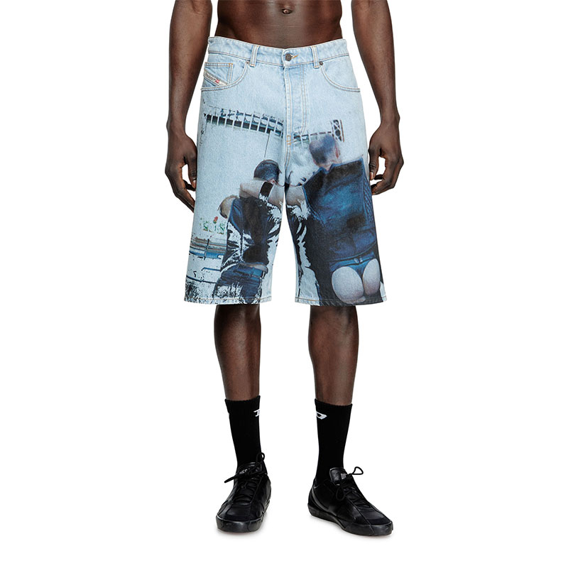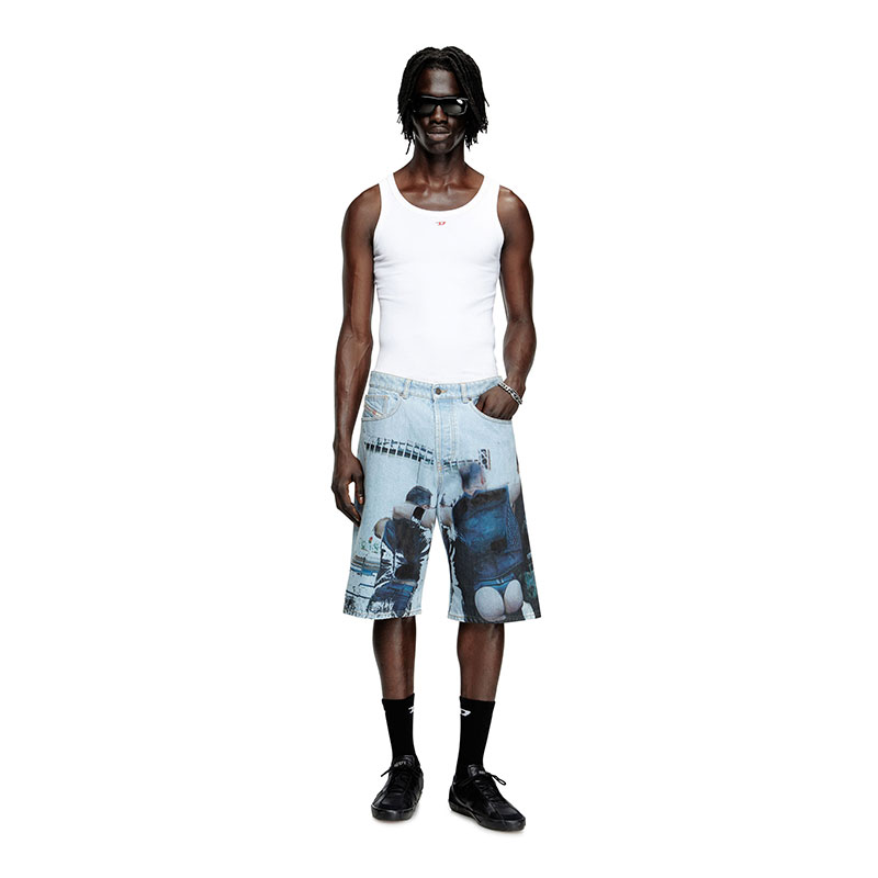 Crafted from fix denim, this Spring Summer 2025 Runway wash is entirely distressed in Italy. A unique example of Diesel's know-how and innovative approach to denim, it features stonewashed and laser treatments to create whisker motifs. Hand-stitched fringes pair perfectly with the shades of the underlying fabric, creating a signature "trompe l'oeil" look that blurs the line between 2D and 3D.