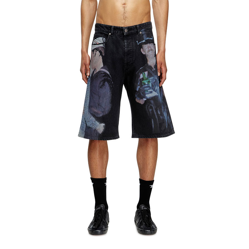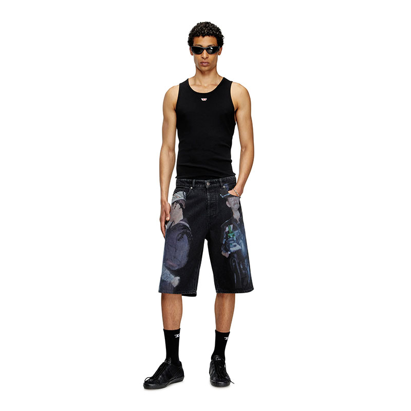 Five-pocket bermuda shorts with a wide leg, crafted from black stonewashed fix denim. Part of a special Pride capsule created in partnership with Tom of Finland Foundation, they feature a custom multicolour print expressing the importance of self-expression and sexual freedom. A custom black tape on the back loop features an inspiring message from the Foundation’s legendary namesake artist, Tom of Finland.