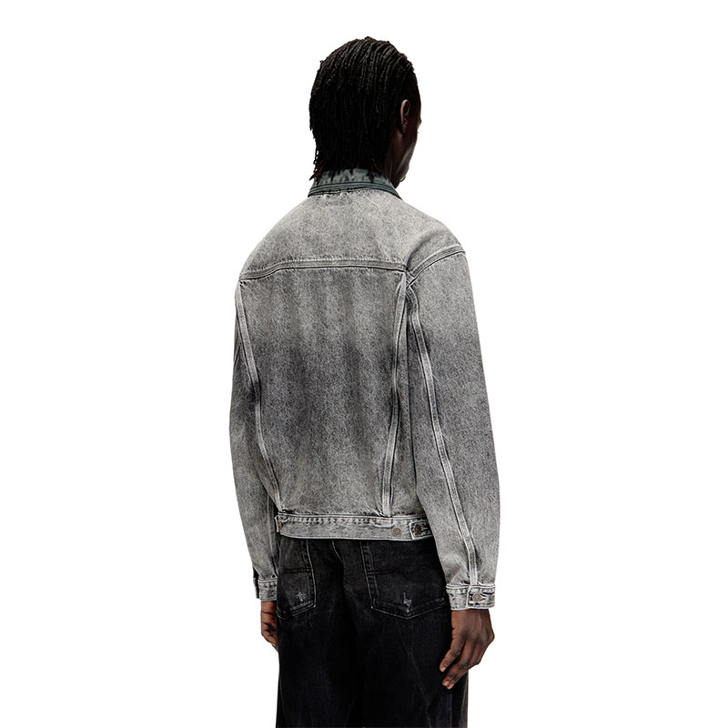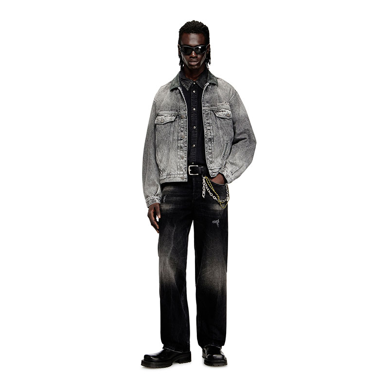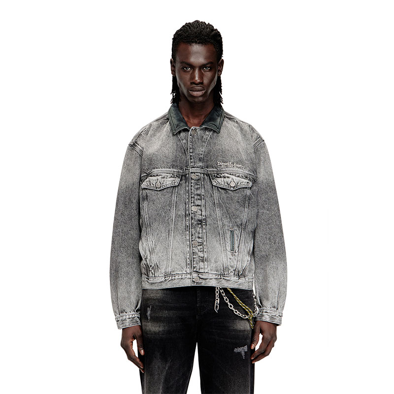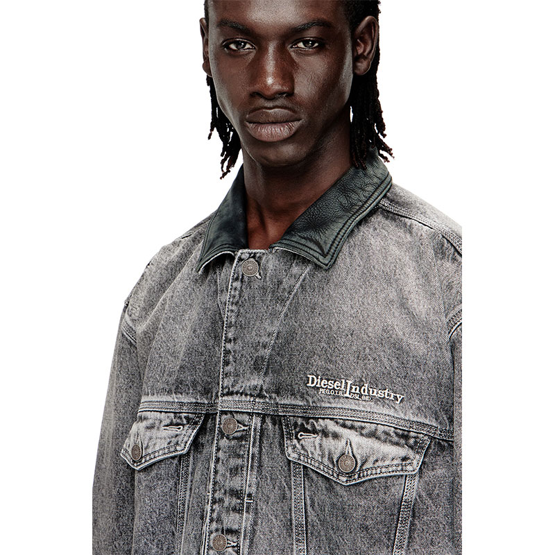 A bold reinterpretation of archival design, this trucker jacket channels '80s aviator energy with its oversized shoulders and slightly cropped, slim-cut hem. It's crafted from grey cotton and hemp denim, stonewashed and treated with bleach effects that enhances the raw look and feel. The tonal leather collar and embroidered Diesel Industries logo complete this iconic style, fusing a retro attitude with contemporary edge.