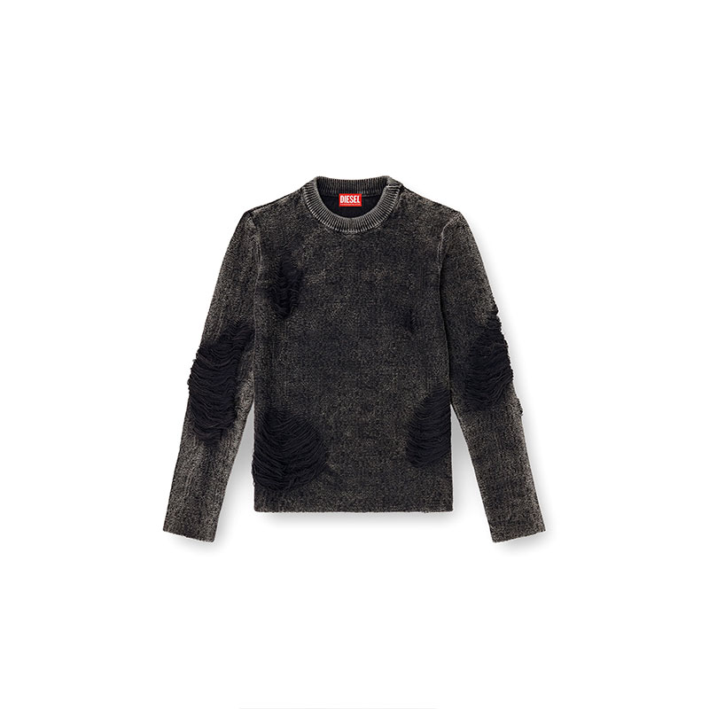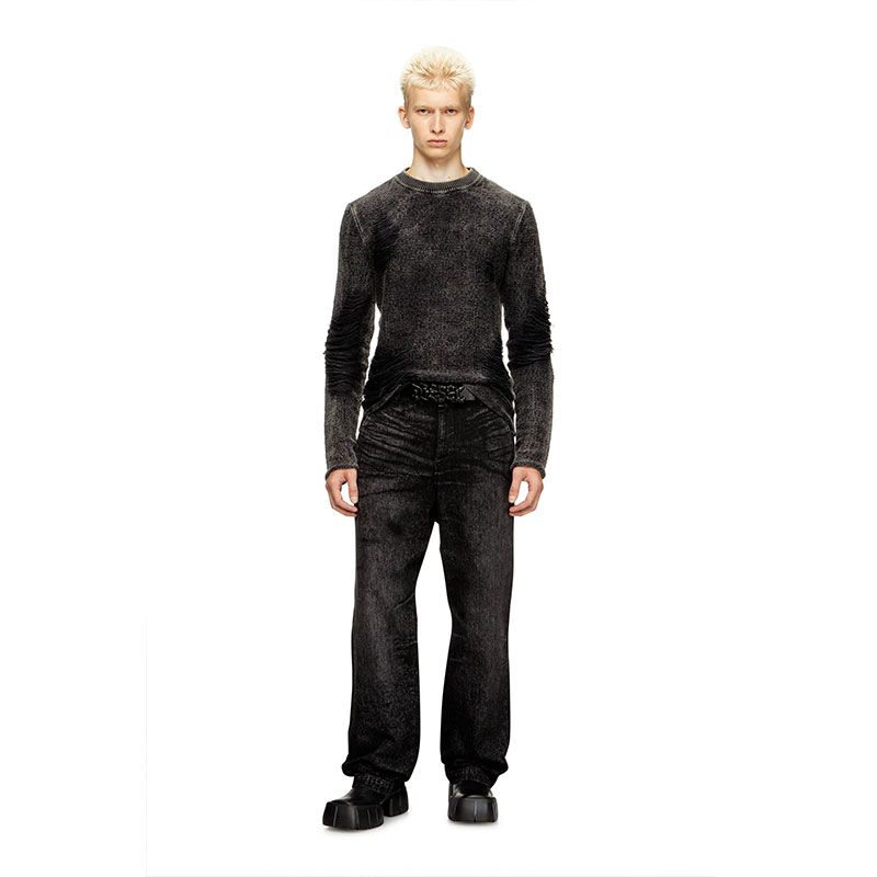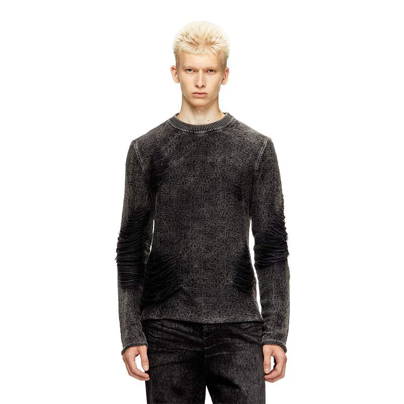 This men’s sweater is one of many expressions of Diesel’s sartorial language seen during the FW25 Runway Show. Knitted from organic cotton yarn in a black indigo hue, it features an elaborate overdyed construction with meticulously engineered rips, ladders and hanging threads – elevation through disruption.
