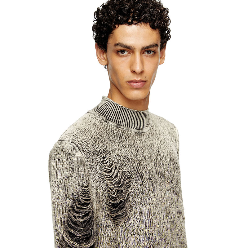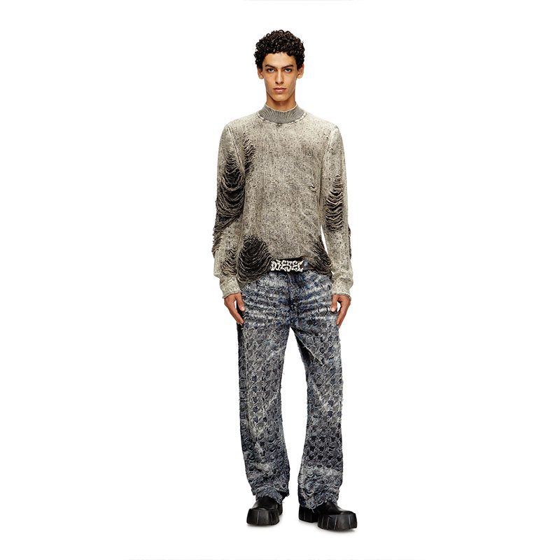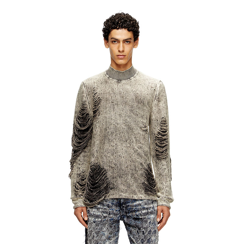 This men’s sweater is an exclusive FW25 Runway Show piece with a rebellious soul. Rips, hanging threads and laddered distressing reveal deeper indigo tones of the knit and signal the disruption of classic codes. It’s crafted from 100% organic cotton and features a mock neckline.