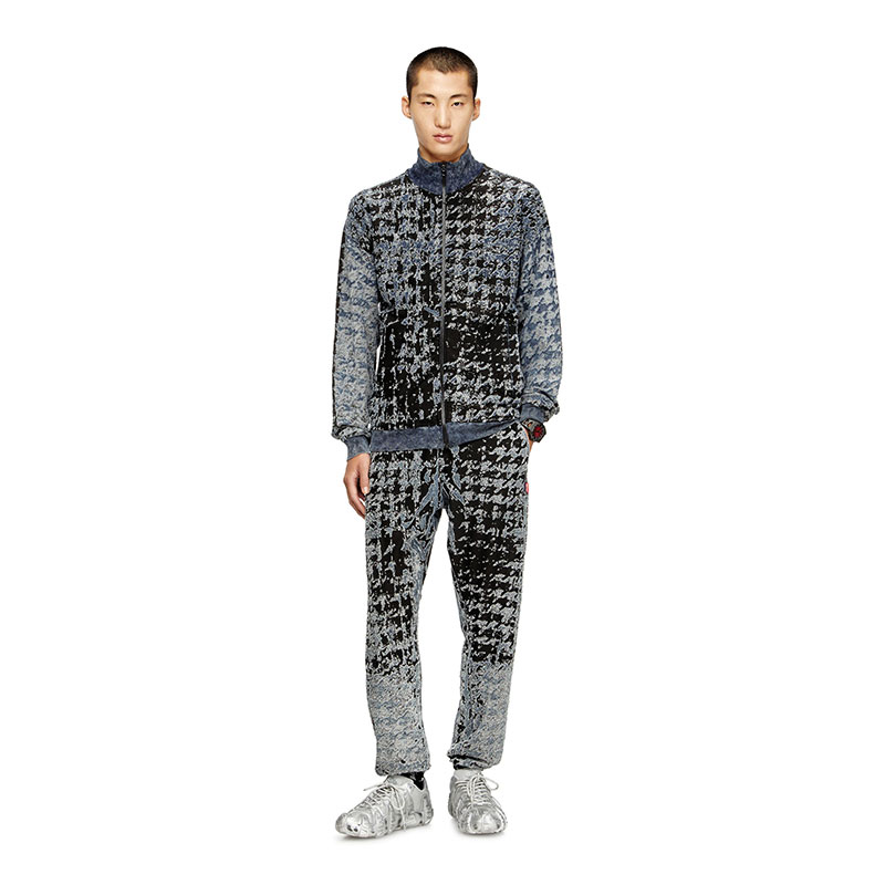 An exclusive FW25 Runway Show piece, this men's zip-up top distorts classic houndstooth checks with a signature destroyed aesthetic. The exaggerated motif on devoré cotton jersey looks obliterated and non-uniform, bolstered by a tie-dye treatment. The indigo hue is evocative of Diesel’s core fabric – denim.