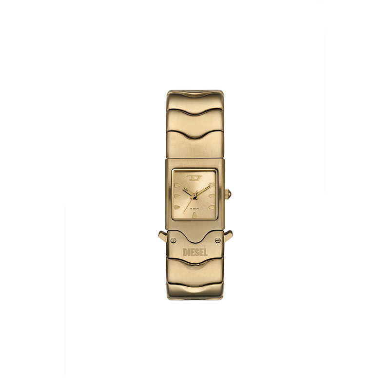 Diesel's 22mm Closer watch features a gold sunray dial, three-hand movement, and a gold-tone stainless steel bracelet with a buckle closure.