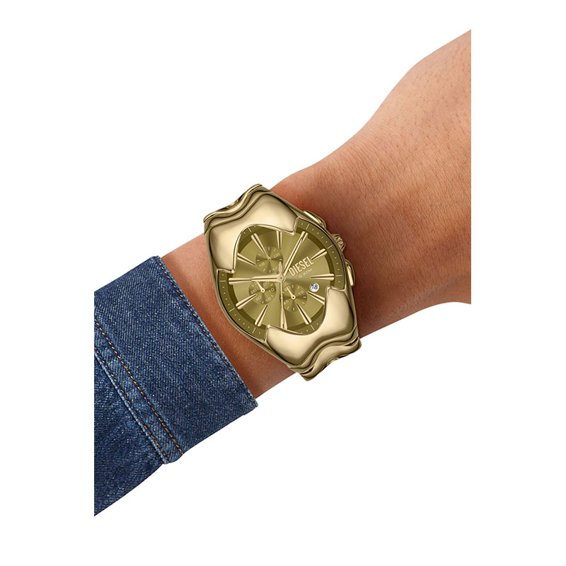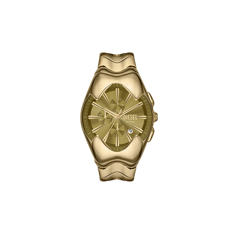 Diesel's 45mm Mercurial watch features a gold sunray dial, chronograph movement, and a polished gold-tone stainless steel bracelet.